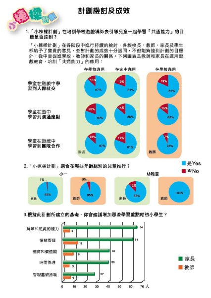 同時,遊戲學習能成為教師和家長的好幫手,教師可以設計和轉化遊戲並應用在不同的教學領域上,家長也可以隨時運用適當的遊戲來培育子女。當遊戲學習成為兒童的生活習慣時,遊戲學習中的教育目標也就隨之而發揮效能了。「小棟樑計劃」不但是兒童學習「共通能力」的入門課,也是培訓家長和教師成為遊戲導師的藍本,更是拉緊家長和教師互動合作的良好契機。但願這份套件繼續發揮影響力,讓每一位踏進校園的小伙子成為「小棟樑」,又讓每一位陪伴兒童成長的成年人成為彼此協作的遊戲導師。